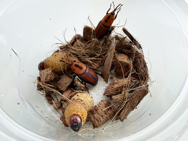 「ヤシオオオサゾウムシ」の幼虫と成虫