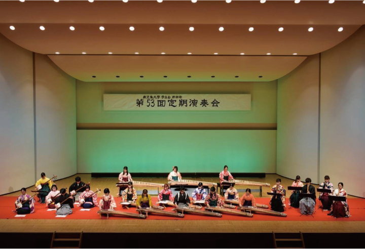 箏、三味線、尺八などの和楽器を演奏します。部員の大半は大学から始めた初心者ですが、互いに切磋琢磨して練習に励んでいます。12月には定期演奏会を開催しますので、ぜひ和楽器の美しい音色を聞きに来てください。 主将:桃原 研希さん(共同獣医学部3年)
