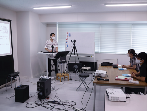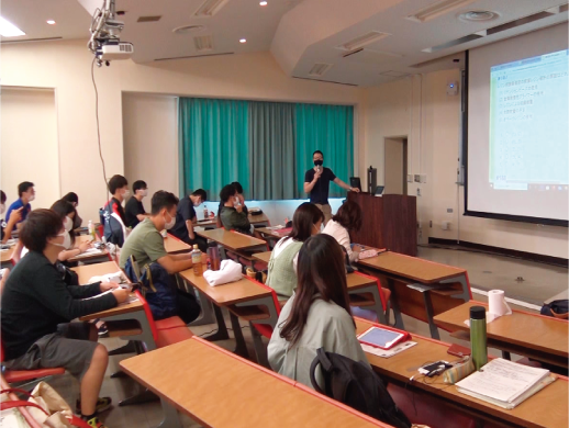 保健体育科の専門科目「体育心理学Ⅰ」では、学生たちが体育学習の心理を学んでいます。教室に遠隔用機器を設置することで、学生は対面でもオンラインでも受講できます。