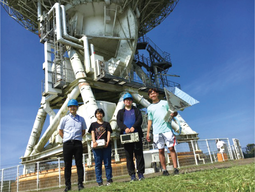 1~3年生を対象とした課外研究活動です。この写真は入来町にある電波望遠鏡に、1年生のメンバーが作った観測装置を持ち込んで実験した際に撮影したものです。
