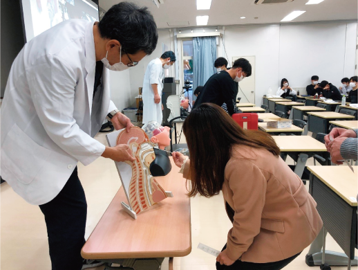 COVID-19などの新興・再興感染症に対応するために必要なPCR検体・抗原検査検体を鼻腔から採取する実習を、シミュレーターを用いて行っています。