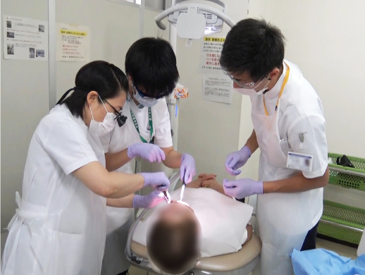 5年生後期から1年間、大学病院において臨床実習を行っています。実習は全12診療科において、実際の患者さんに対し、指導歯科医の指導のもとで歯科医行為を行います。