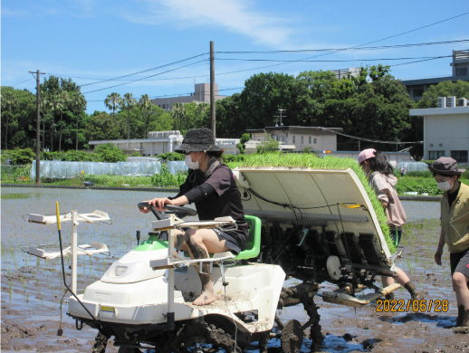 毎年恒例の田植え実習です。横一列に並び、昔ながらの方法で手植えを体験した後に、学生一人一人が交代で田植え機を操作して、手植えと機械植えの両方を体験します。