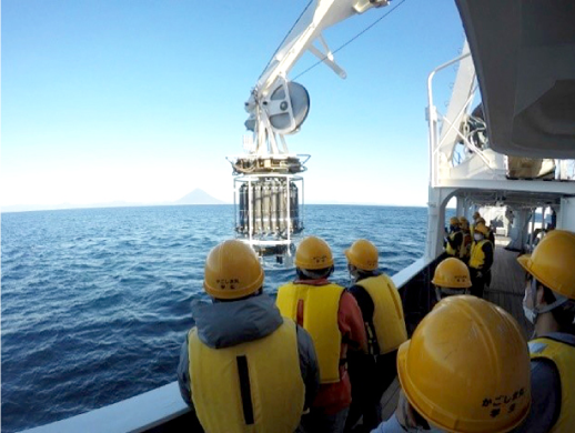 実習船「かごしま丸」を用いての実習で、開聞岳を望む薩摩半島沖合で海洋観測を行っています。水温や流速などを計測し、黒潮の流れ方や温暖化の状況を調べます。