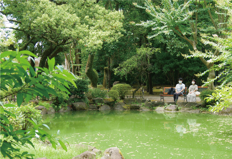 庭園をイメージさせる玉利池には、鯉や亀などさまざまな生物が住んでいます。学生や職員の方々が自然と集まり、気付けば談笑しているような場所です。特に春や秋の季節はベンチに座って一休みするのが気持ちよく、もやもやしていた頭の中が整理されるようなリフレッシュスポットです。