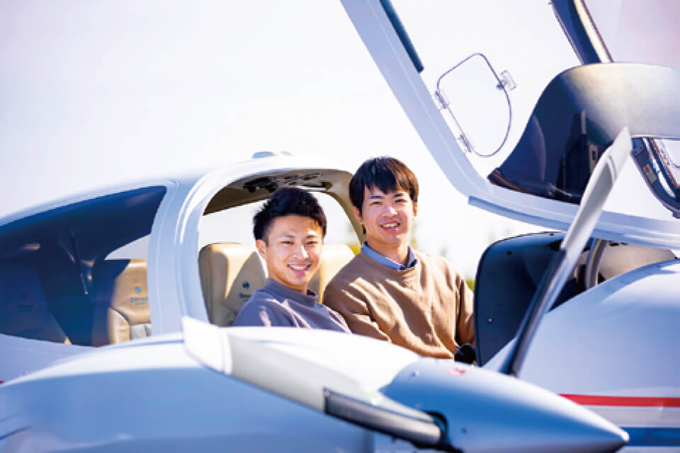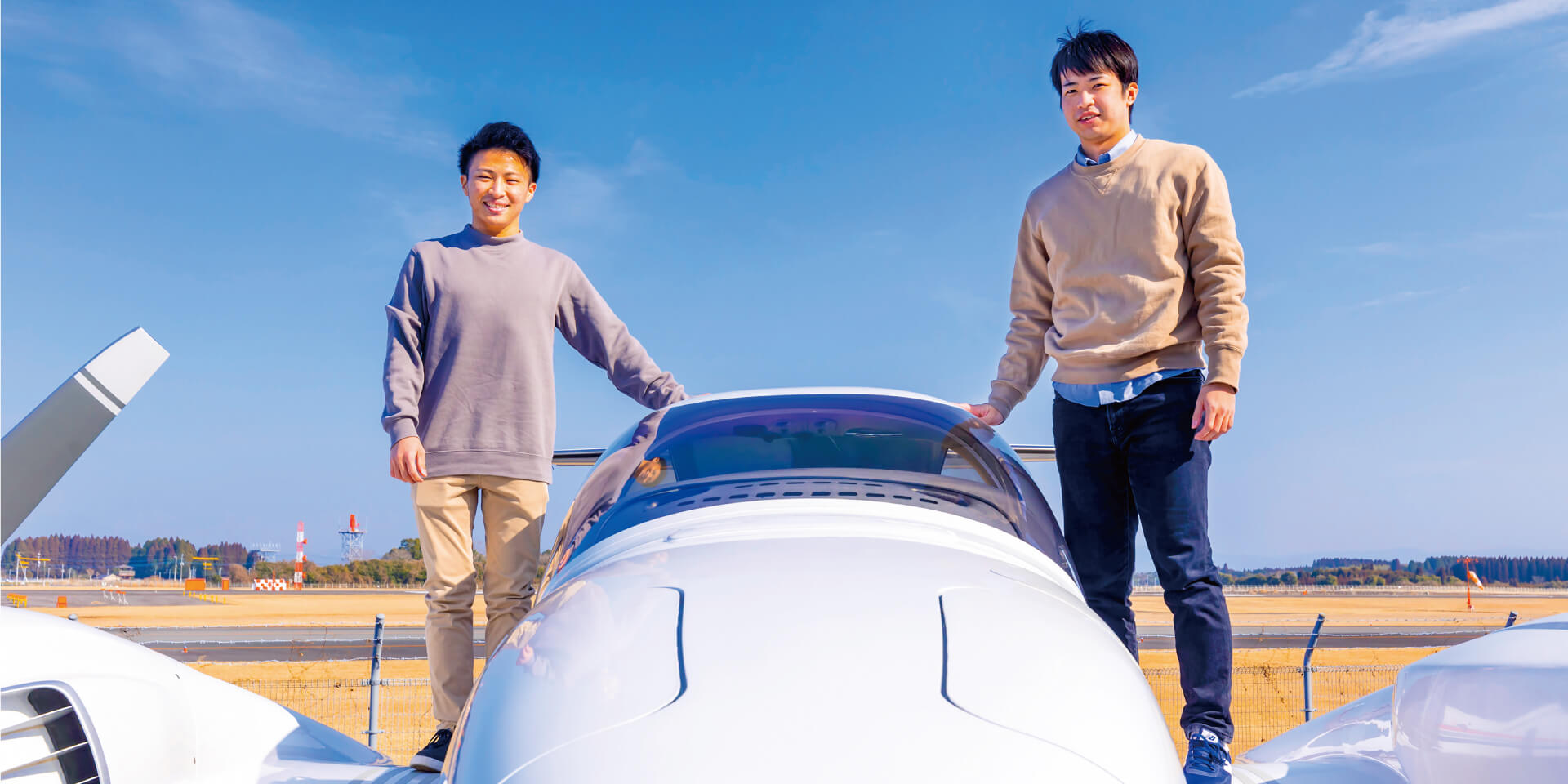 本学とJALグループの連携の下、2020年度に実施された地域密着型パイトット人材創出プログラム「SKYCAMP」参加学生の中から、第1期パイロットライセンス訓練生として選ばれたのが奥紘輔さん(写真左)、立山陸さんです。この春から、共に養成機関である祟城大学(熊本市)に身を置き、研究生として実践的知識や技能を習得します。